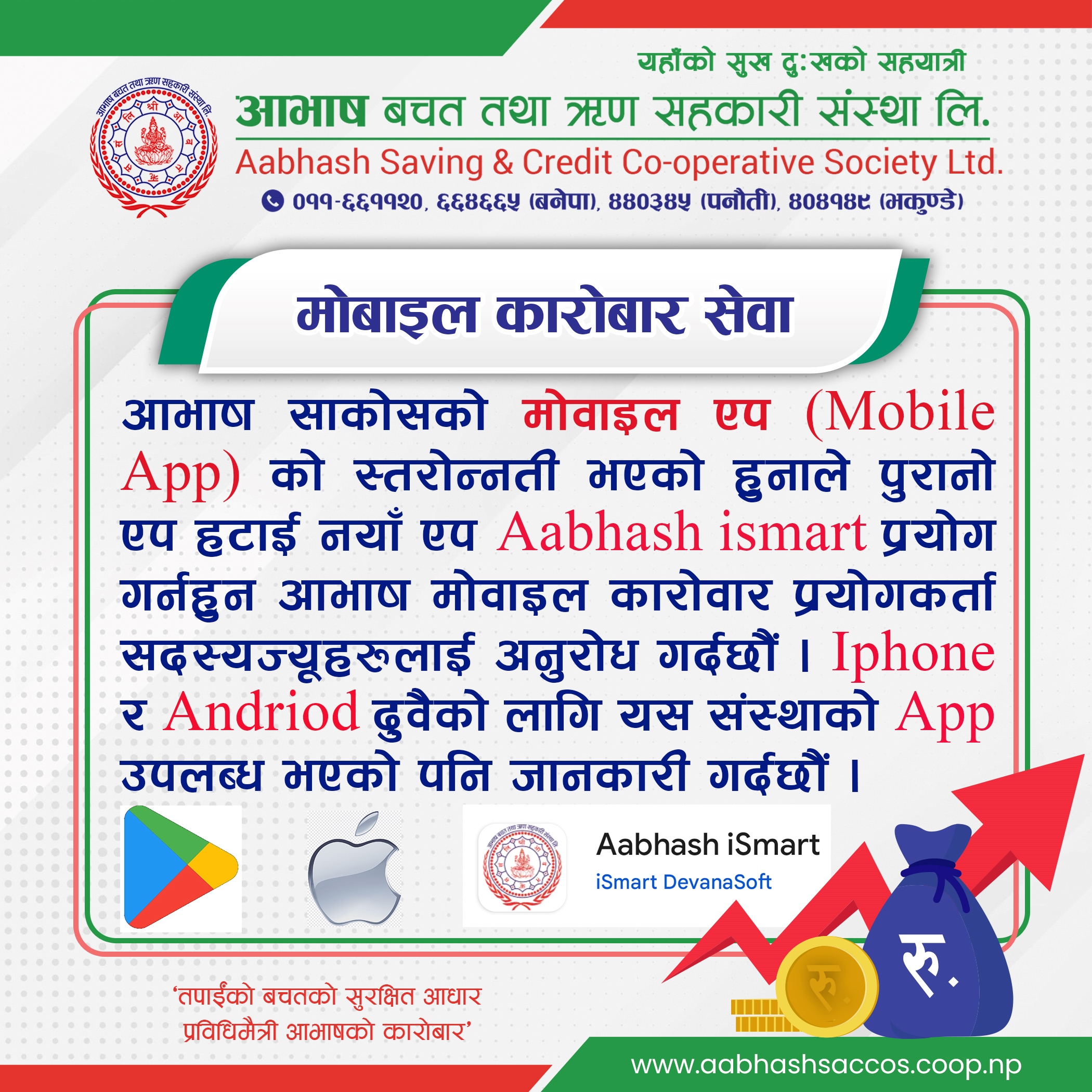 यस आभाष साकोसको पुरानो मोवाइल एप upgrade भएको हुनाले पुरानो App uninstall गरि नयाँ App "Aabhash ismart" download गरि प्रयोग गर्नुहुन सम्पूर्ण सदस्यज्यूहरुलाई अनुरोध गर्दछौ । यदि कुनै असहजता भएमा संस्थामा सम्पर्क गर्नुहोला । Read more..