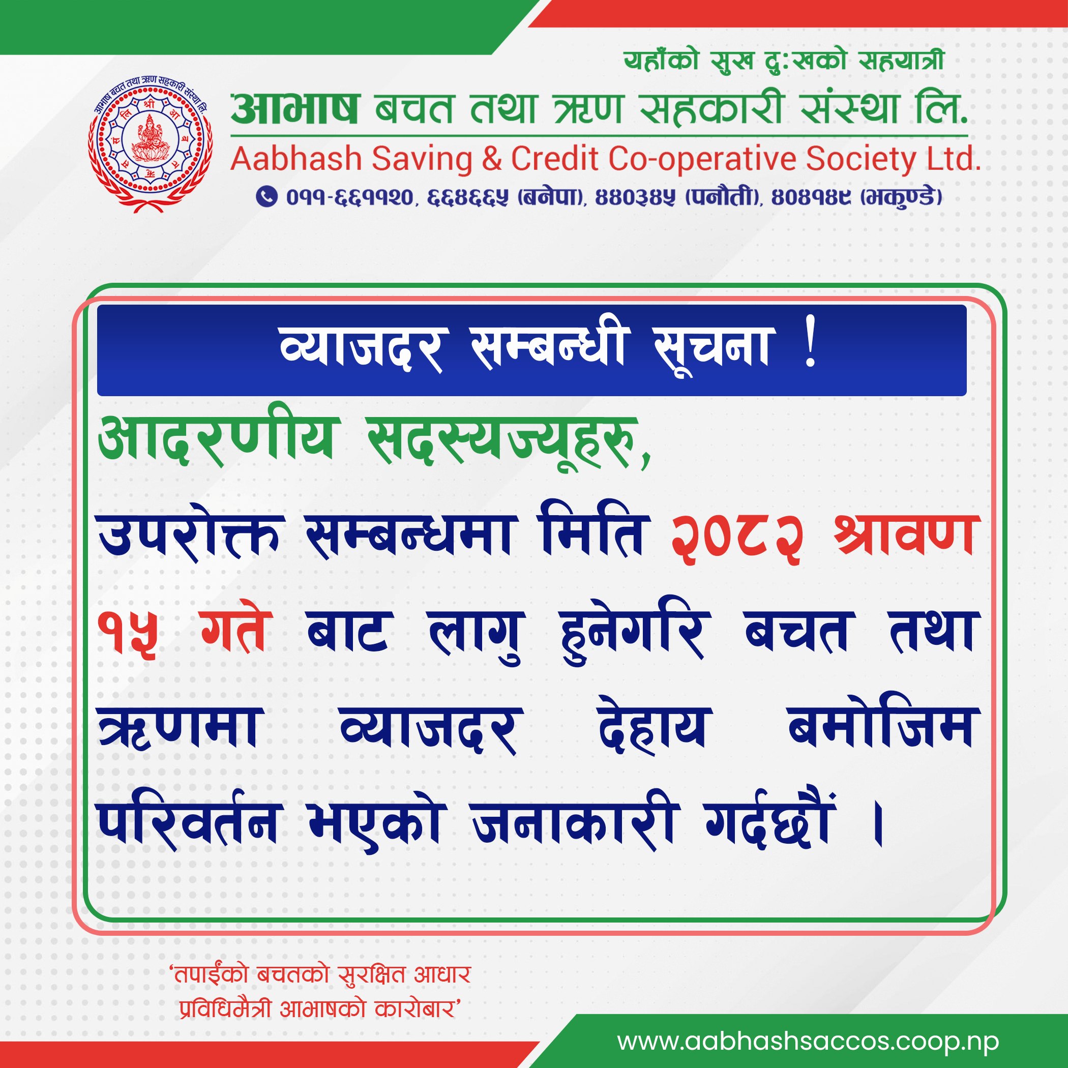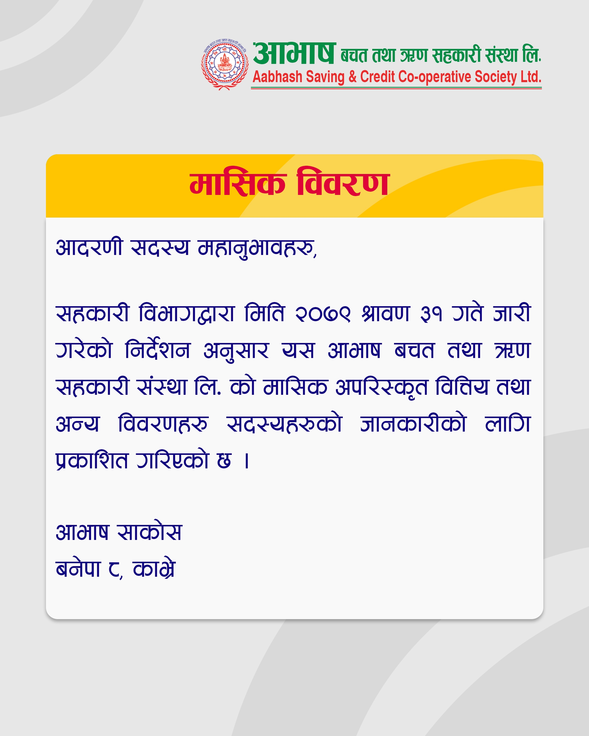 सहकारी विभागद्वारा मिति २०७९ श्रावण ३१ गते जारी गरेको निर्देशन अनुसार यस आभाष बचत तथा ऋण सहकारी संस्था लि. को मासिक अपरिस्कृत वित्तिय तथा अन्य विवरणहरु सदस्यहरुको जानकारीको लागि प्रकाशित गरिएको छ । Read more..